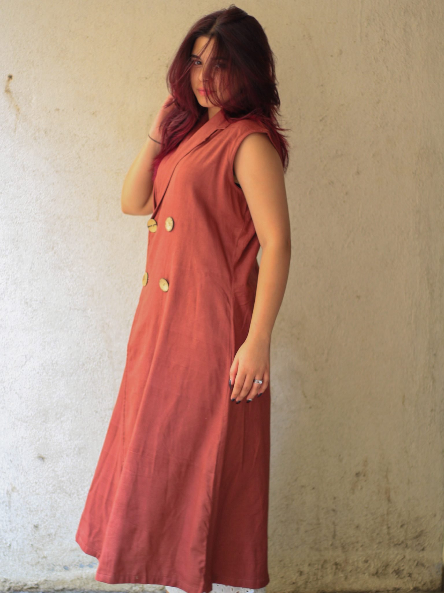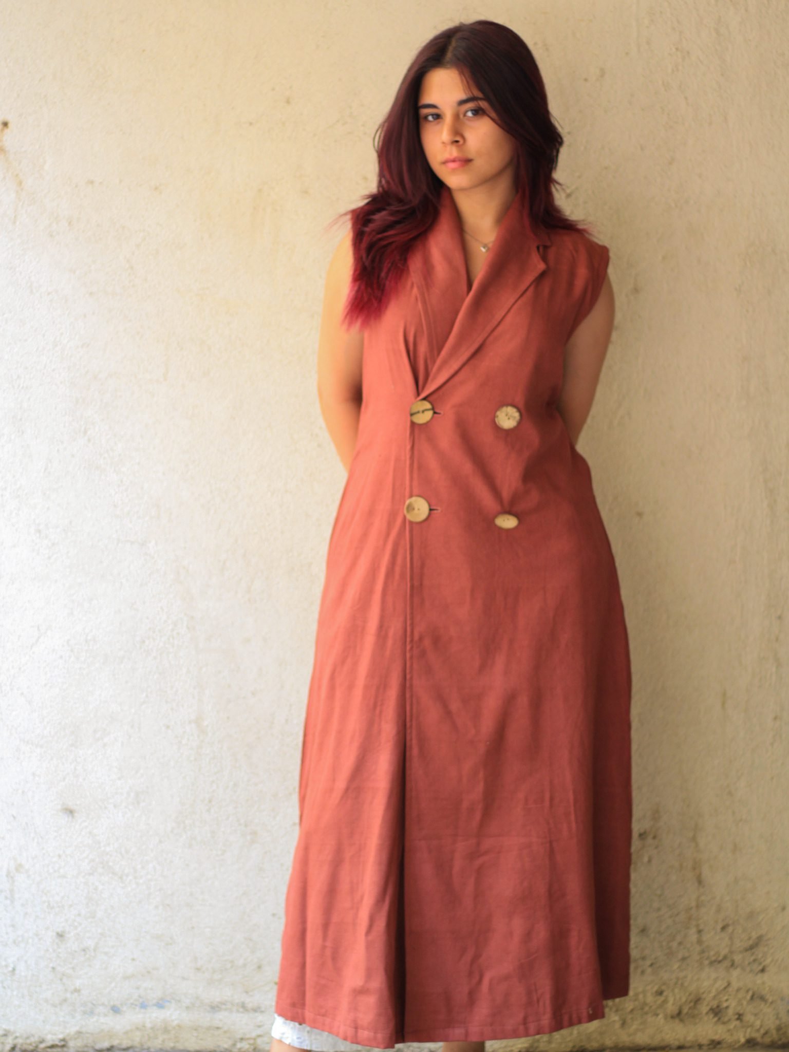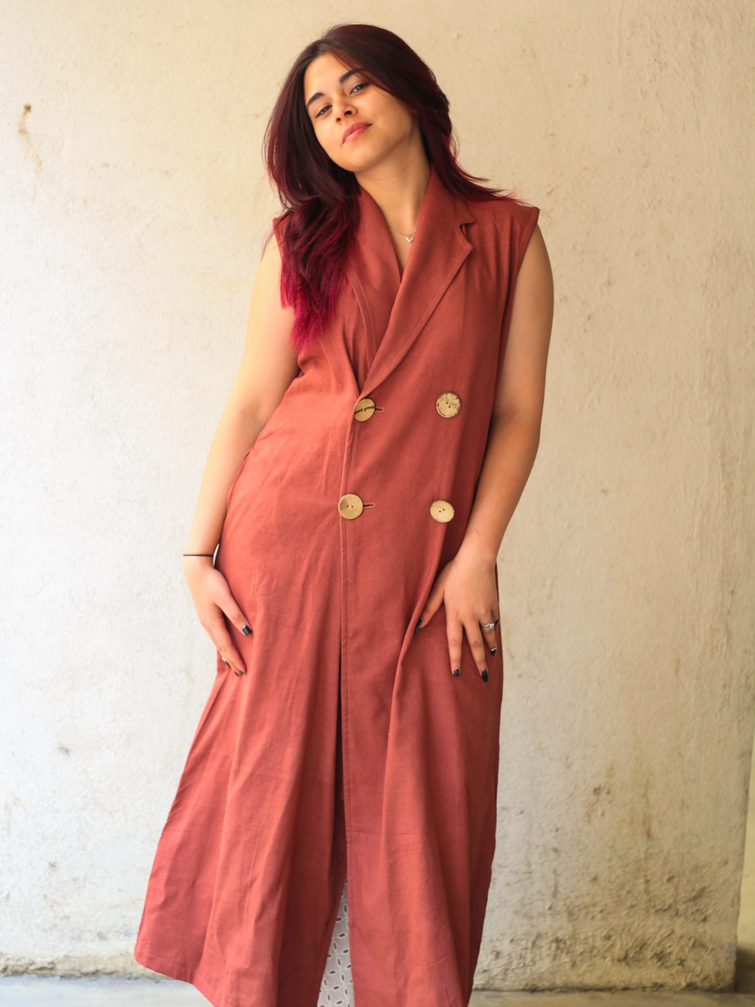 A powerful blend of elegance and intention, the Maple Muse Sleeveless Blazer Dress by Evara is crafted from a luxurious blend of 50% banana fiber and 50% cotton. Designed with a sharp lapel collar and a long, tailored cut, it brings contemporary polish to minimalist dressing.