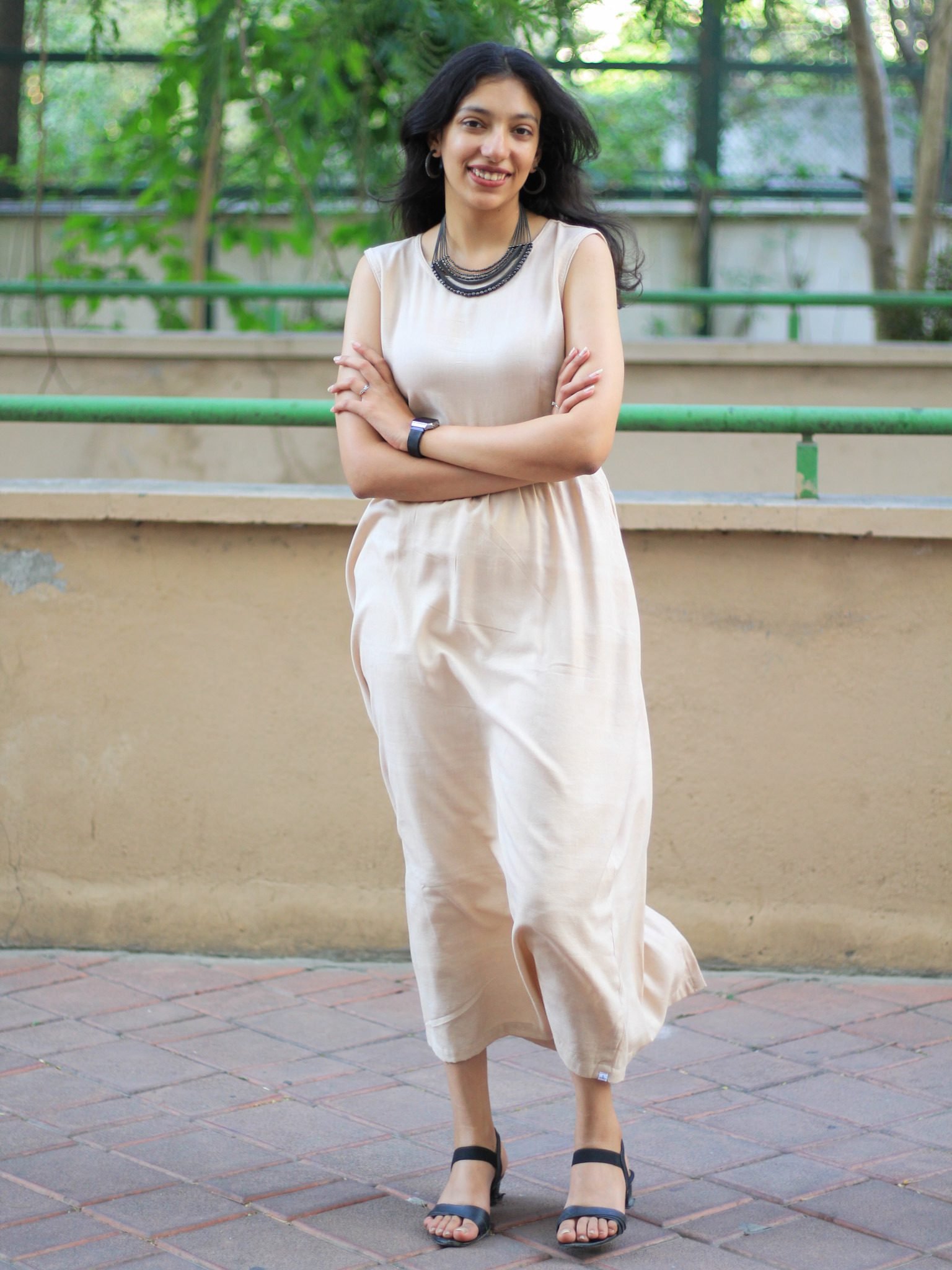 Pair it with statement earrings and block heels for a polished evening look, or layer under a light jacket with sandals for daytime simplicity. For cooler evenings, add a soft shawl or structured tote for functional elegance.