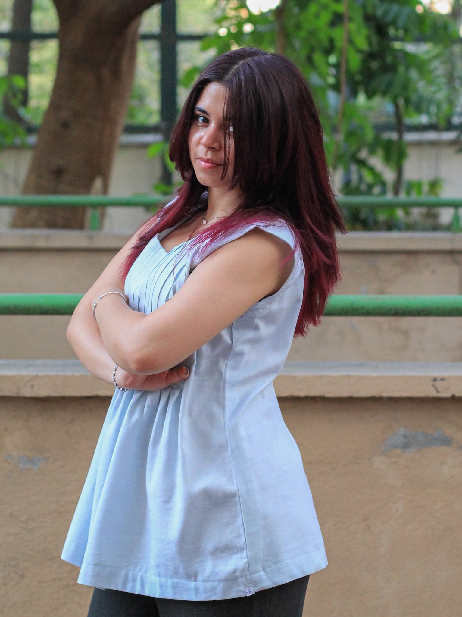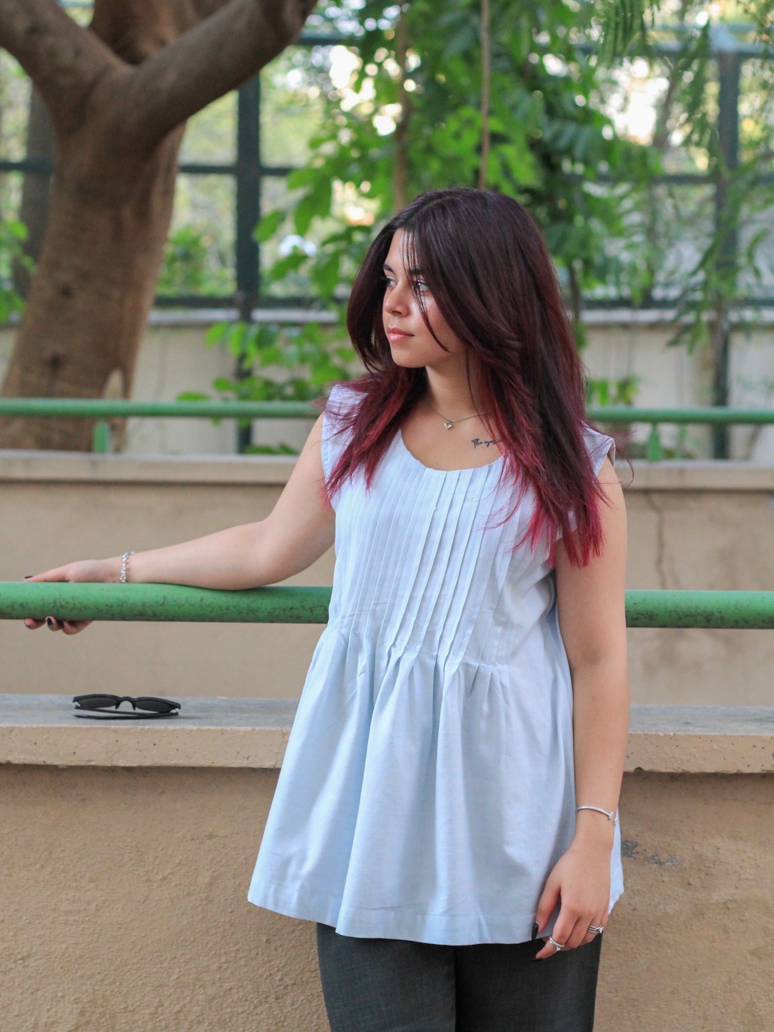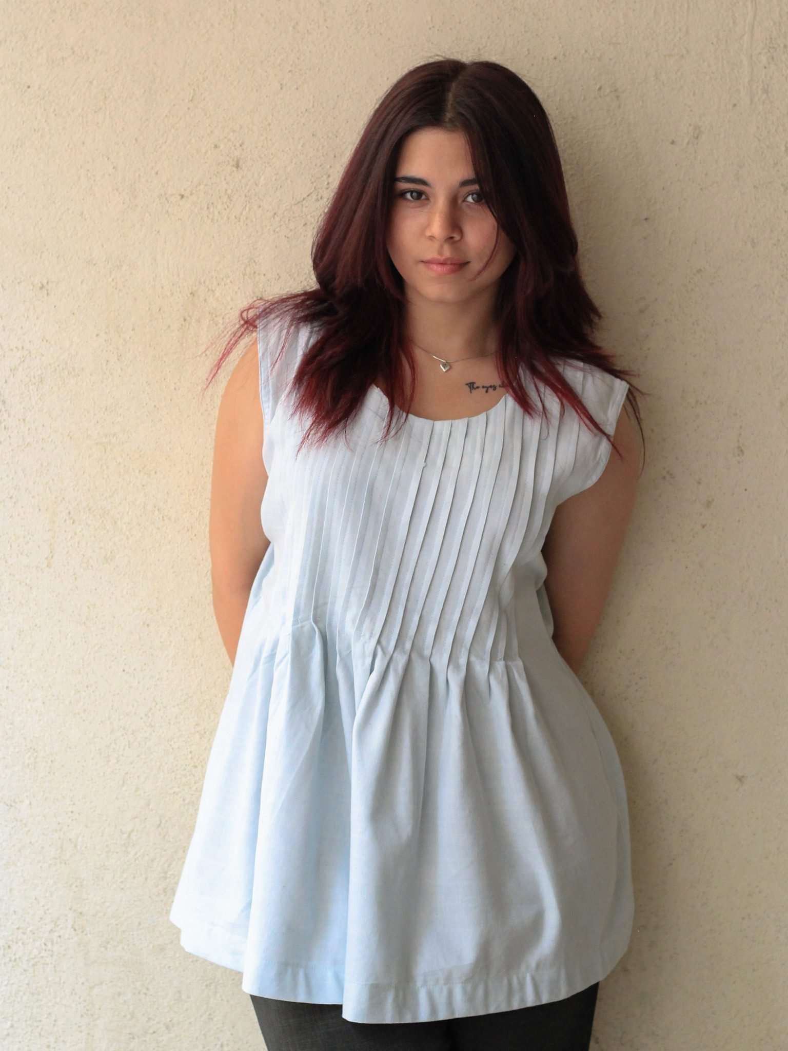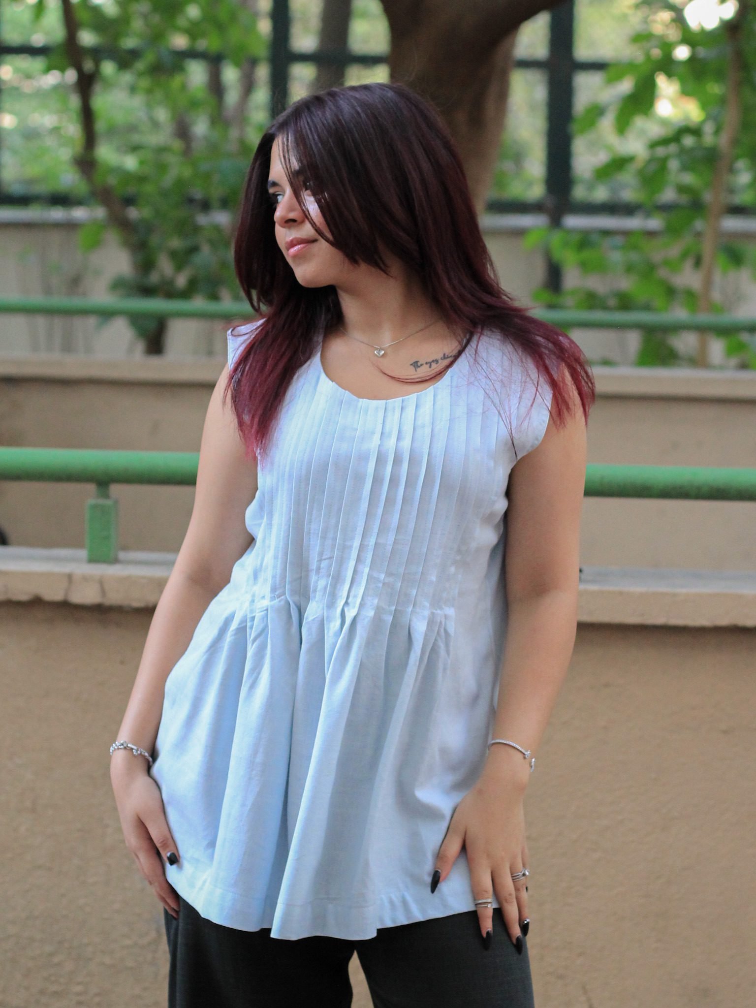 Gracefully minimal yet effortlessly versatile, the Skyline Haze Sleeveless Pleated Top by Evara is where thoughtful tailoring meets laid-back elegance. Made from our signature 50% banana fiber and 50% cotton blend, this sleeveless essential drapes fluidly while maintaining just enough structure for a flattering fit.