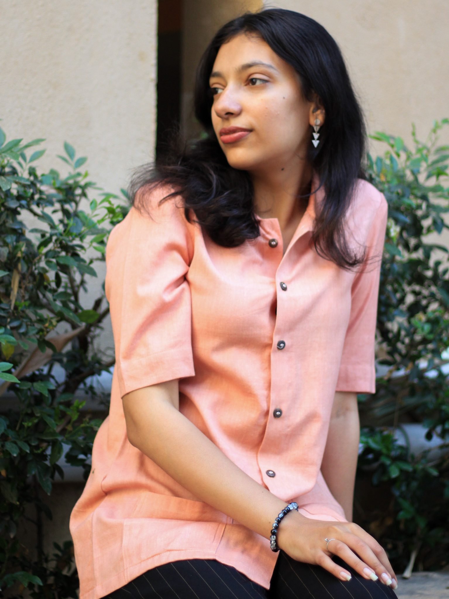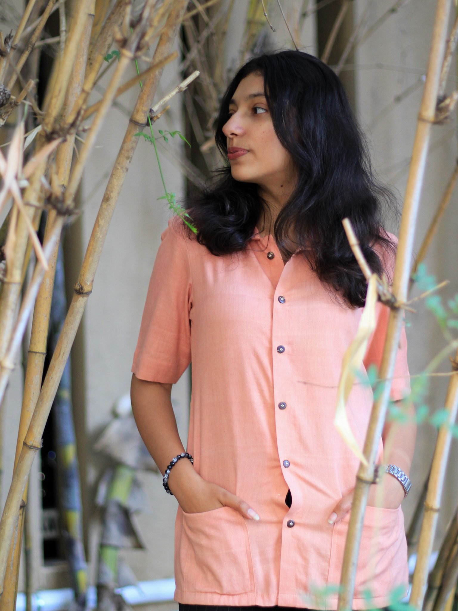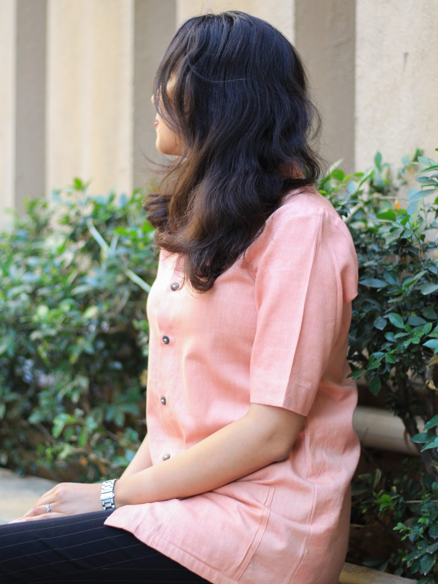 Every Evara garment is crafted in small batches using plant-based fabrics and natural accents, such as coconut shell buttons—mindfully designed for everyday elegance.
